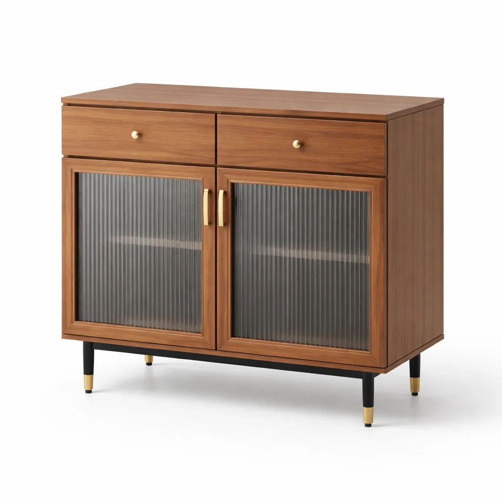 Buffet en bois avec portes en verre texturé et 2 tiroirs