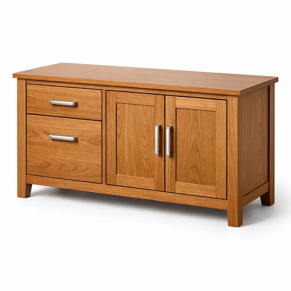 Buffet en bois de chêne clair avec deux portes à charnières et deux tiroirs. Dimensions : L 120 cm, P 40 cm, H 75 cm. Comprend des poignées en alliage métallique. Poids : 30 kg. Couleur : Chêne Clair.