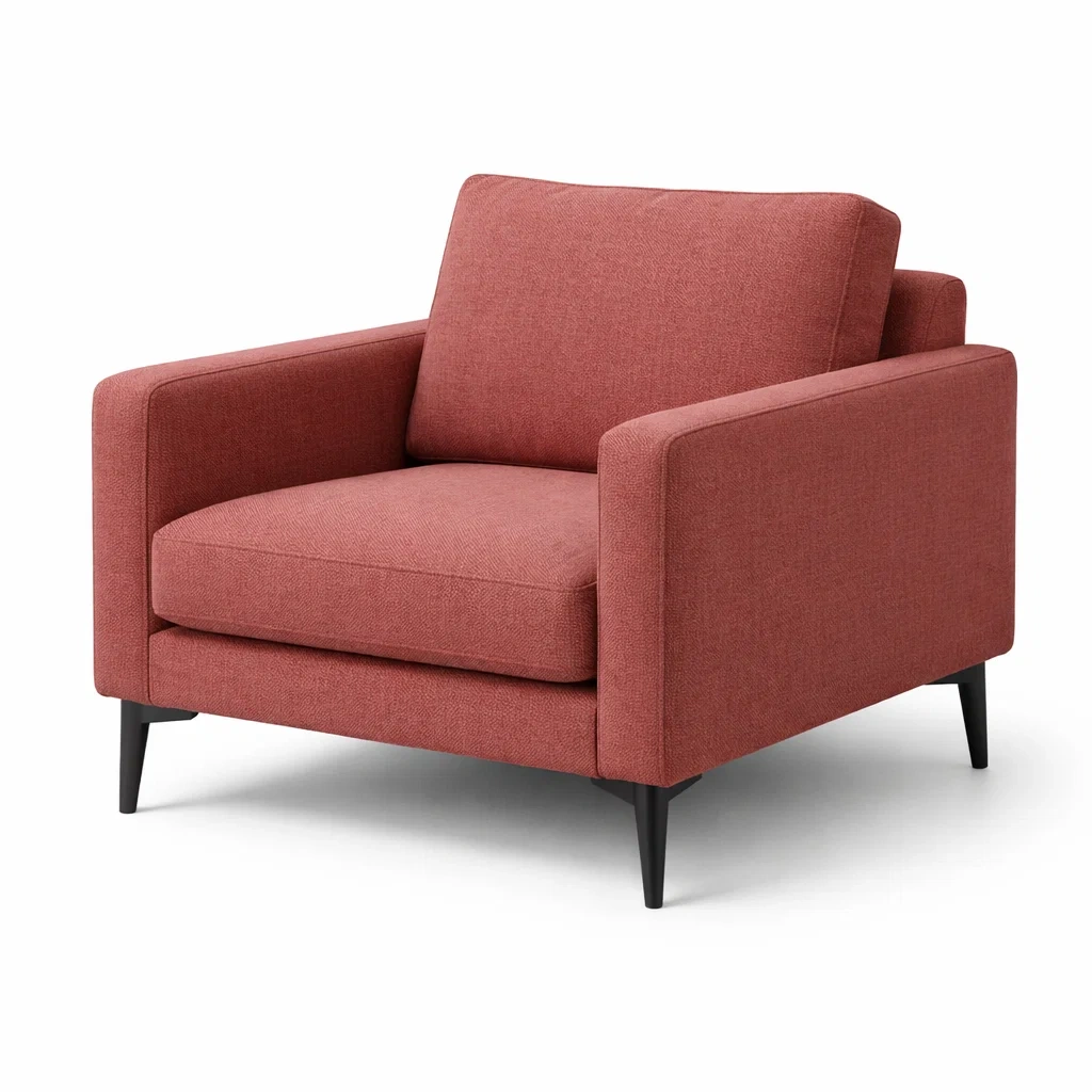 Ce fauteuil est doté d'un revêtement en tissu polyester rouge brique. La structure est en bois massif et les pieds sont en métal. Le coussin d'assise est rempli de mousse haute densité pour un soutien optimal. Les dimensions du fauteuil sont de 85 cm de largeur, 90 cm de profondeur et 75 cm de hauteur. Le poids est de 18 kg. Il est facile à entretenir avec un chiffon doux et sec. Capacité de charge: 120 kg.